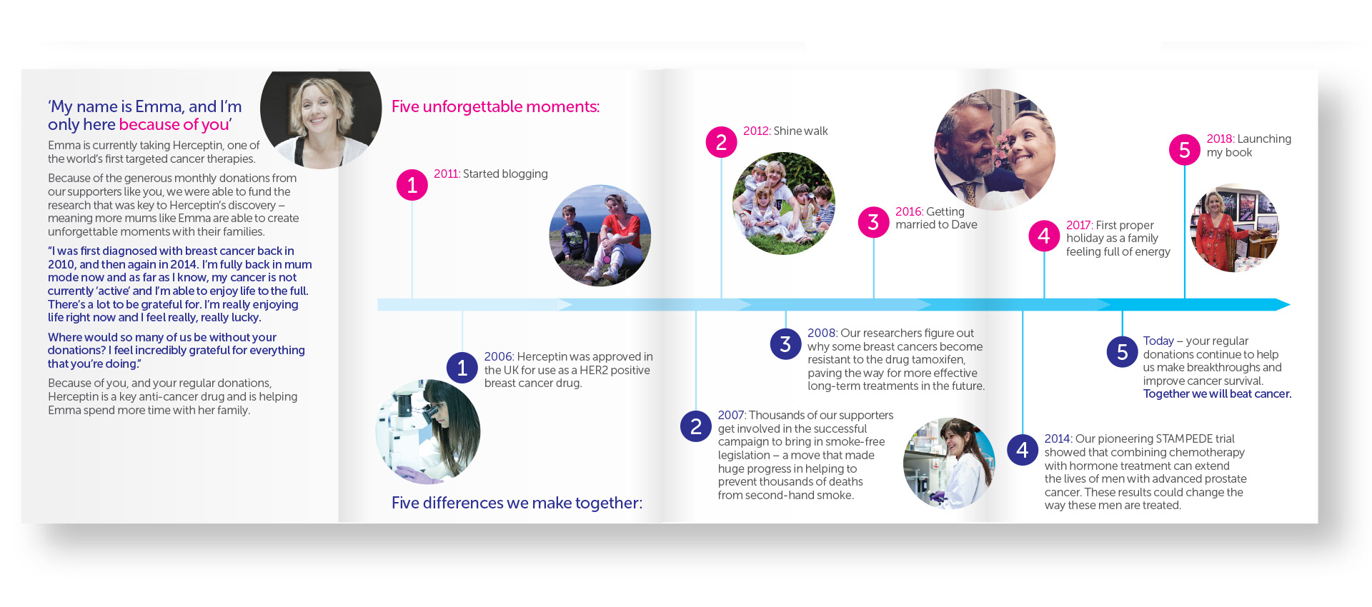 I came up with concept of using five milestones as the theme throughout the mailer to give the pack a more personalised and relevant feel. The main part of the pack was a leaflet that opened to reveal the story of Emma's cancer survival. It also continued the theme of five by juxtaposing five moments of Emma's story alongside five major research breakthroughs.