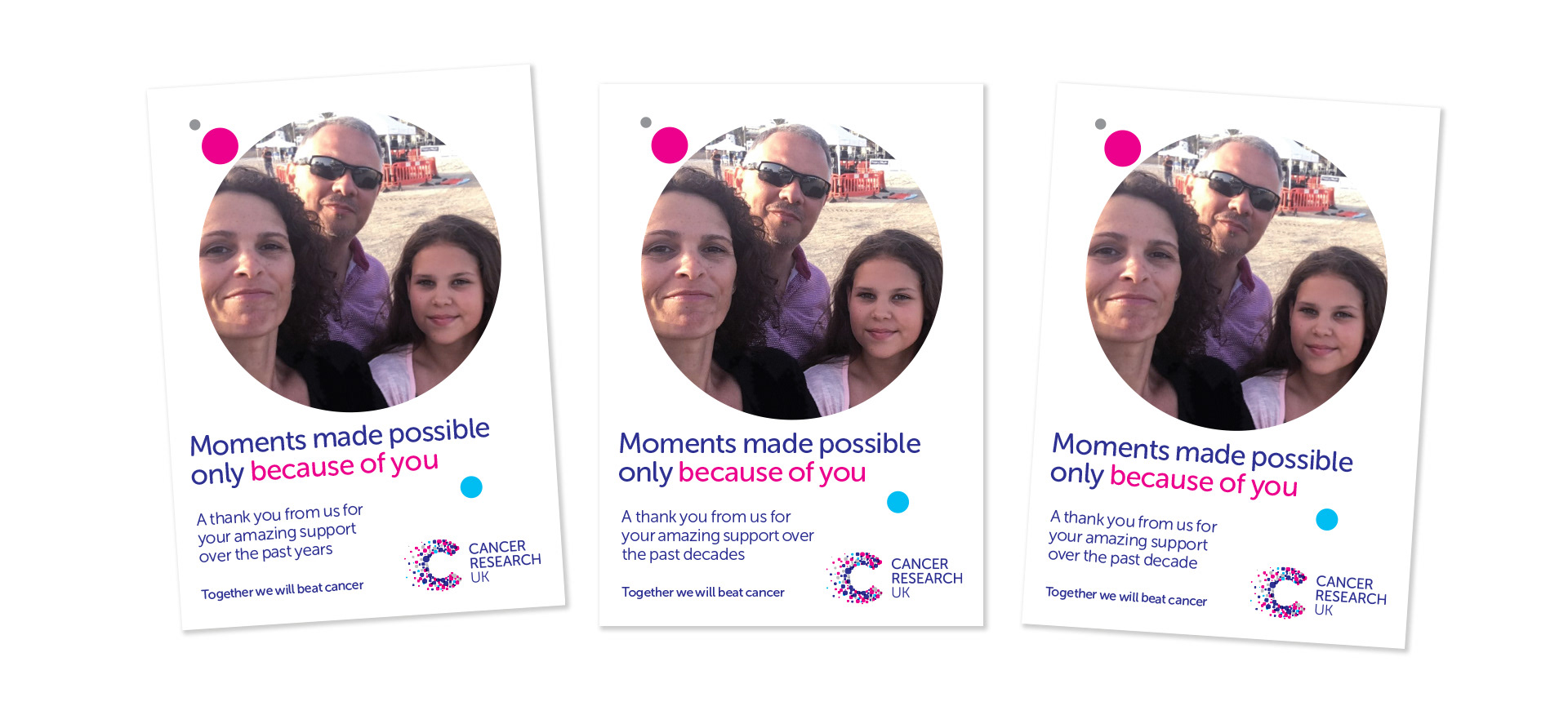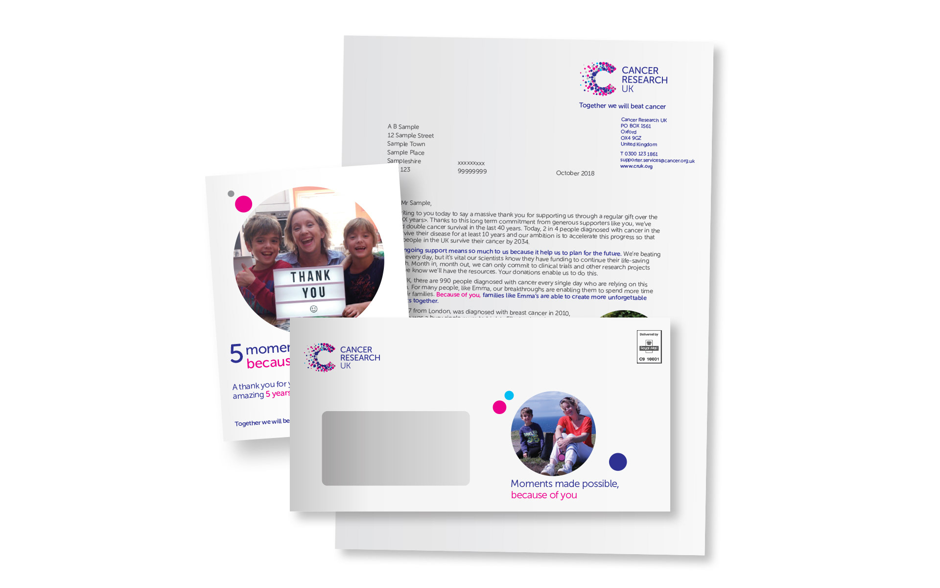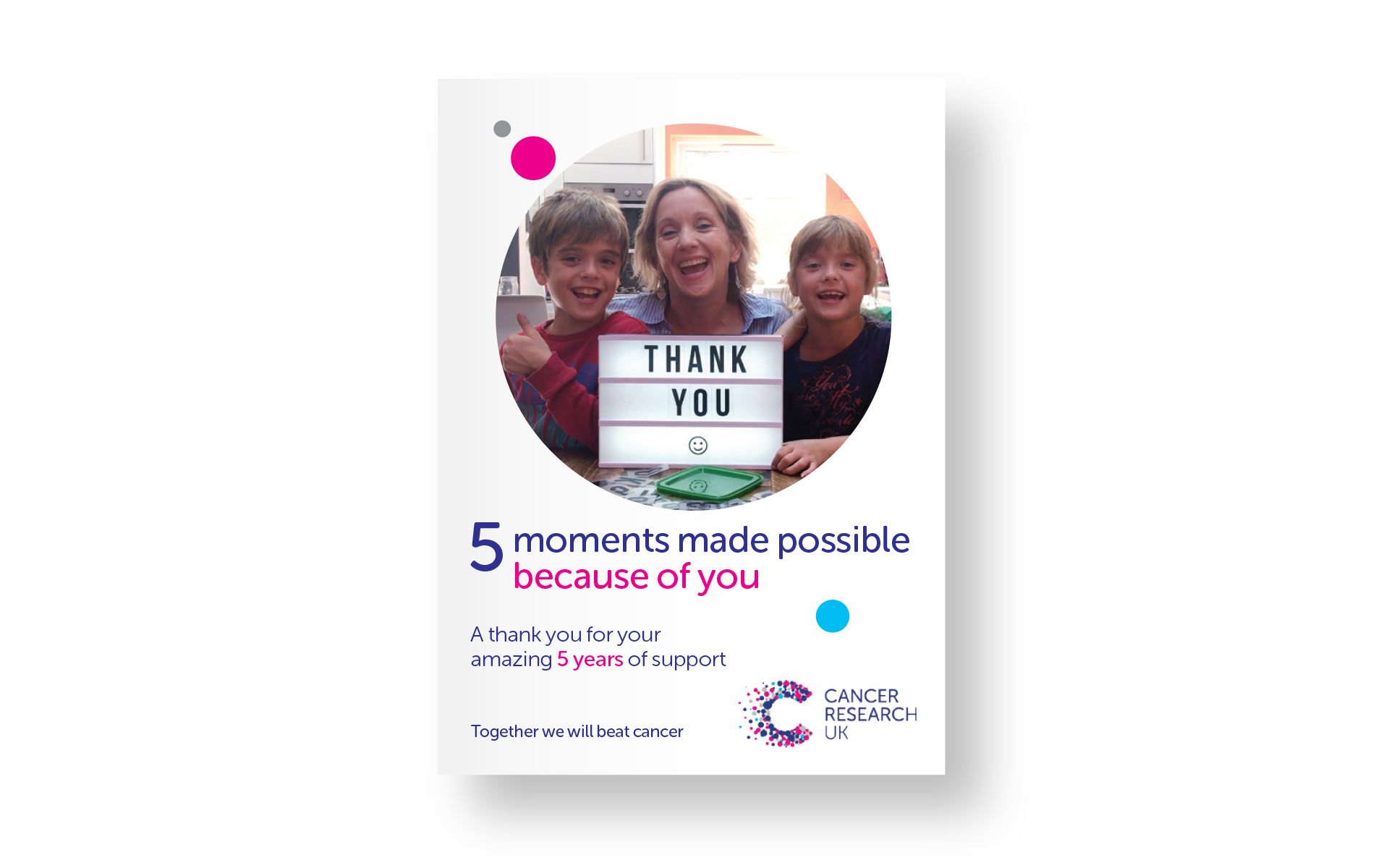I was tasked by the Supporter Experience Team at Cancer Research UK to create a mailing pack which was sent to supporters who had reached the milestone of supporting Cancer Research UK for five years.