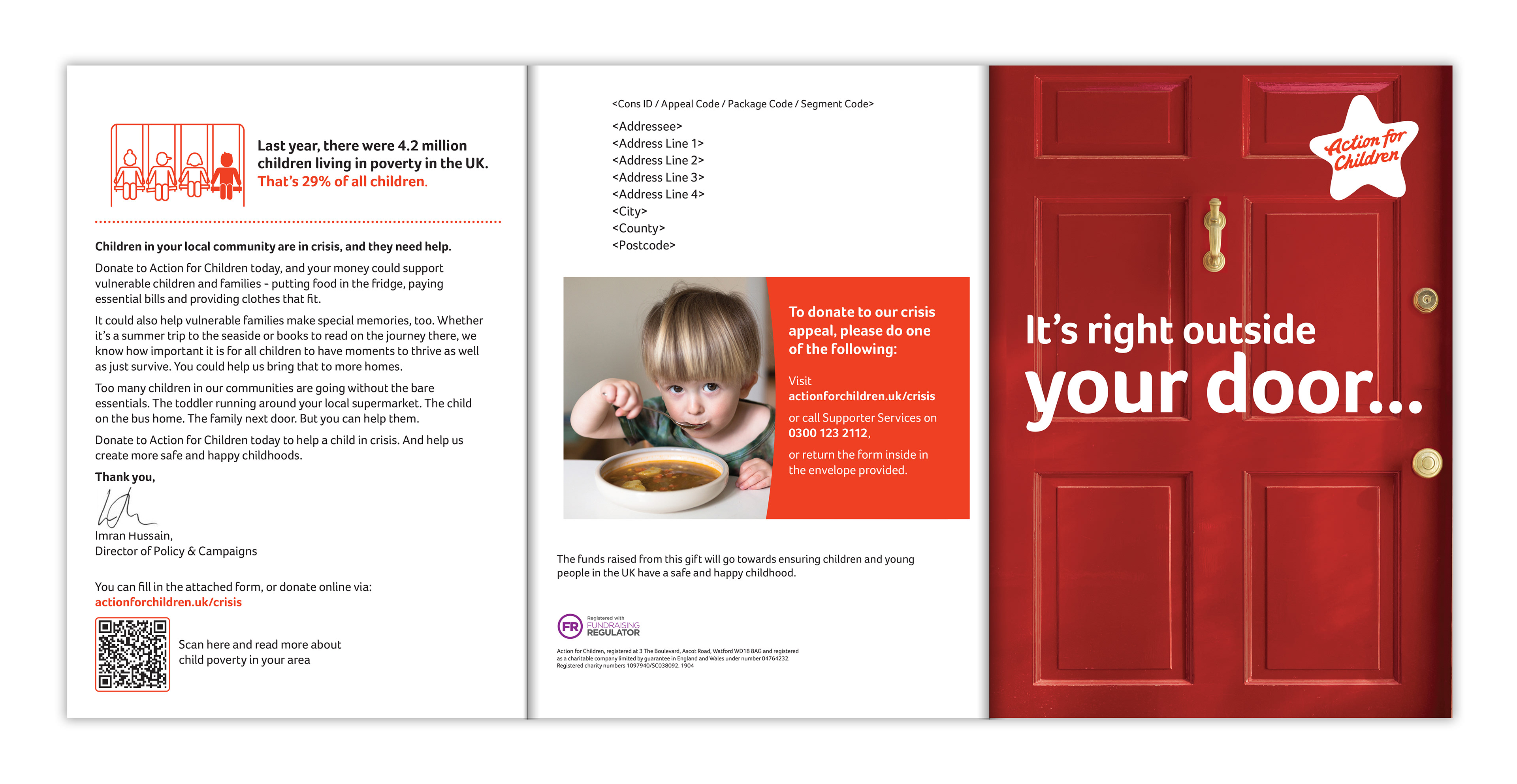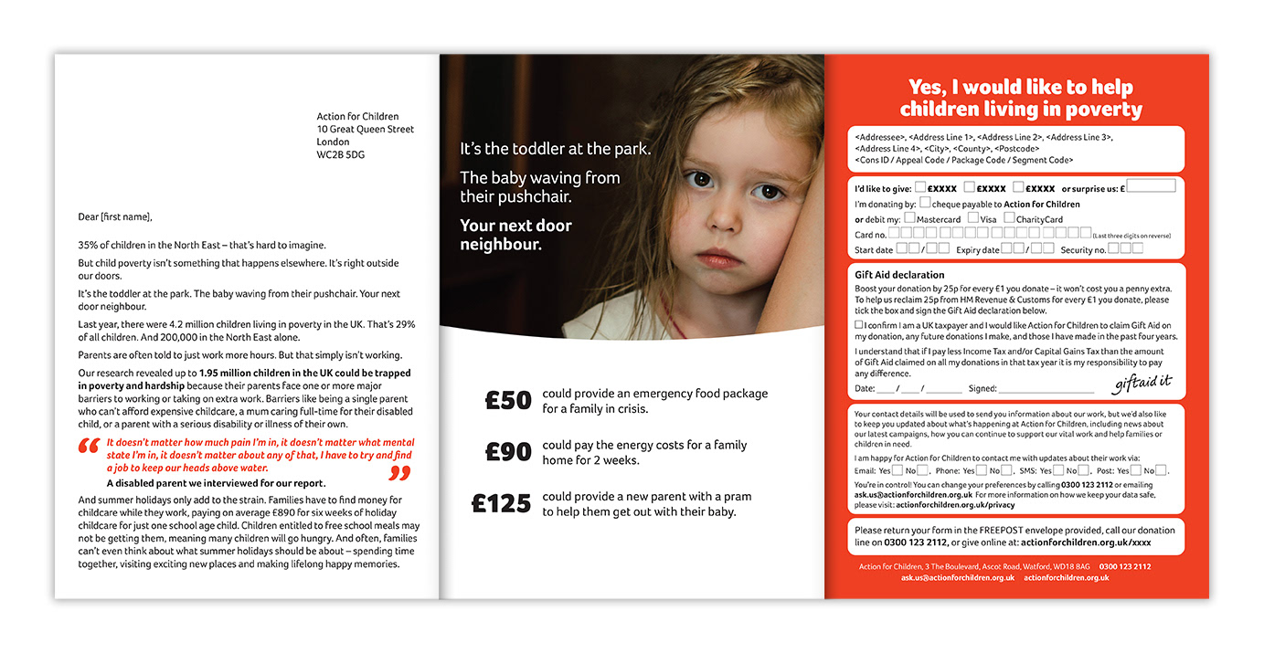 I created a leaflet instead of a letter, using a simple eye-catching image of a red door with the headline on it. The inside featured both infographics, images and different asks depending on the supporter segmentation. We were also able to vary the outer depending on region, so the outside of the envelope would feature a relevant poverty infographic.