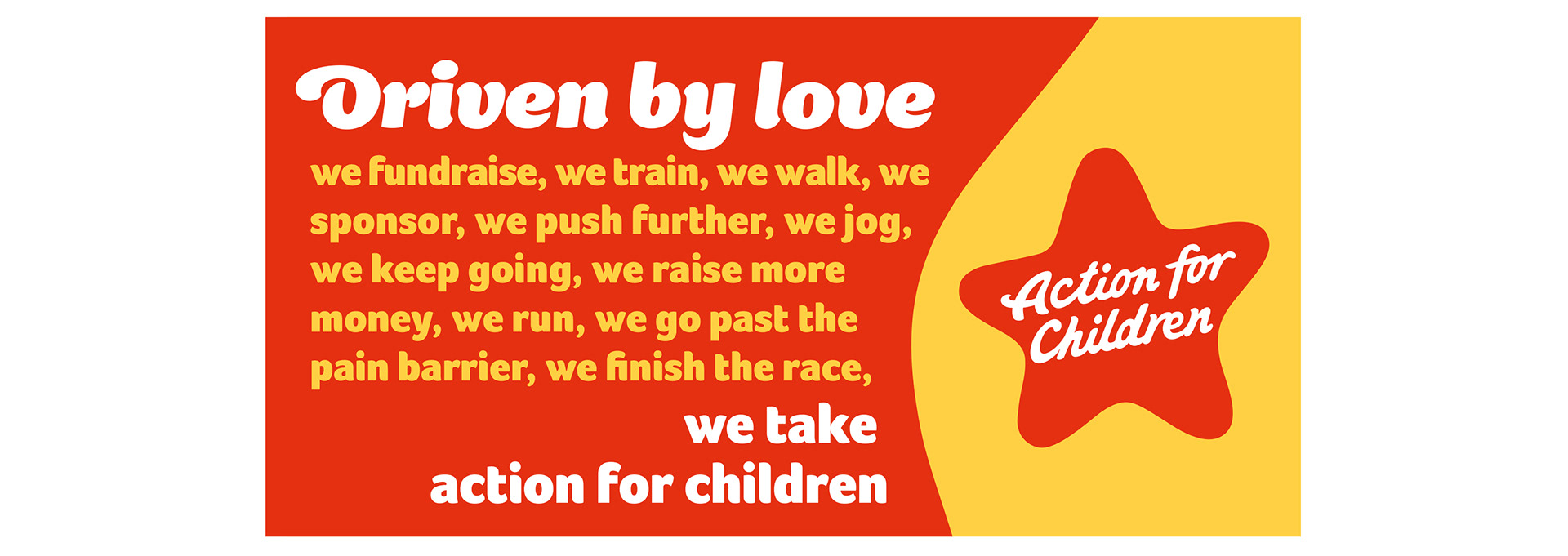 I recommended we based the portfolio redesign on our new brand proposition "Driven by love, we take Action for Children" as this closely aligned with the participation of our events. Creating a copy showing a deeper dive into how our runners are driven by love.
