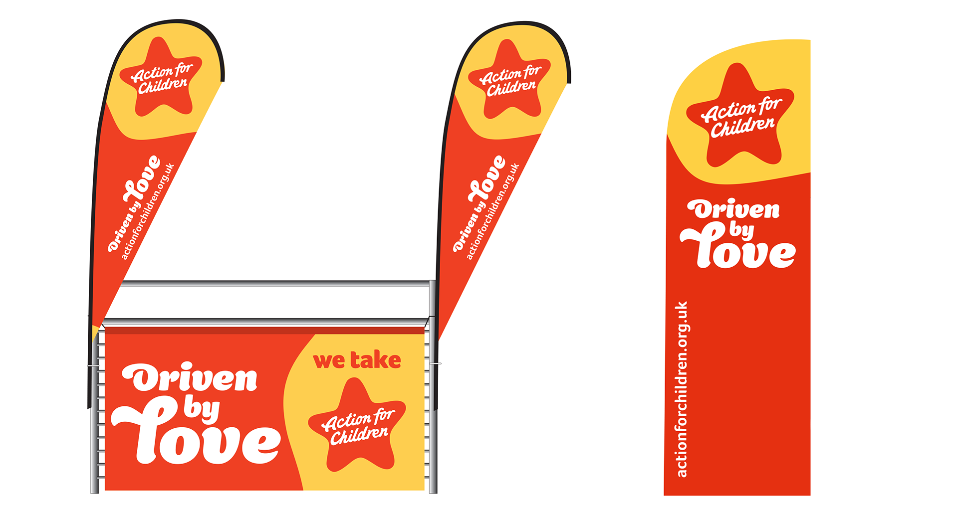 The current vests used the secondary brand colour yellow vest to be more recognisable in a crow but but lacked depth and felt disconnected to our brand. Similarly the banner and flags were in yellow with strapline "Safe and happy childhood" feeling too placid for a sporting event.