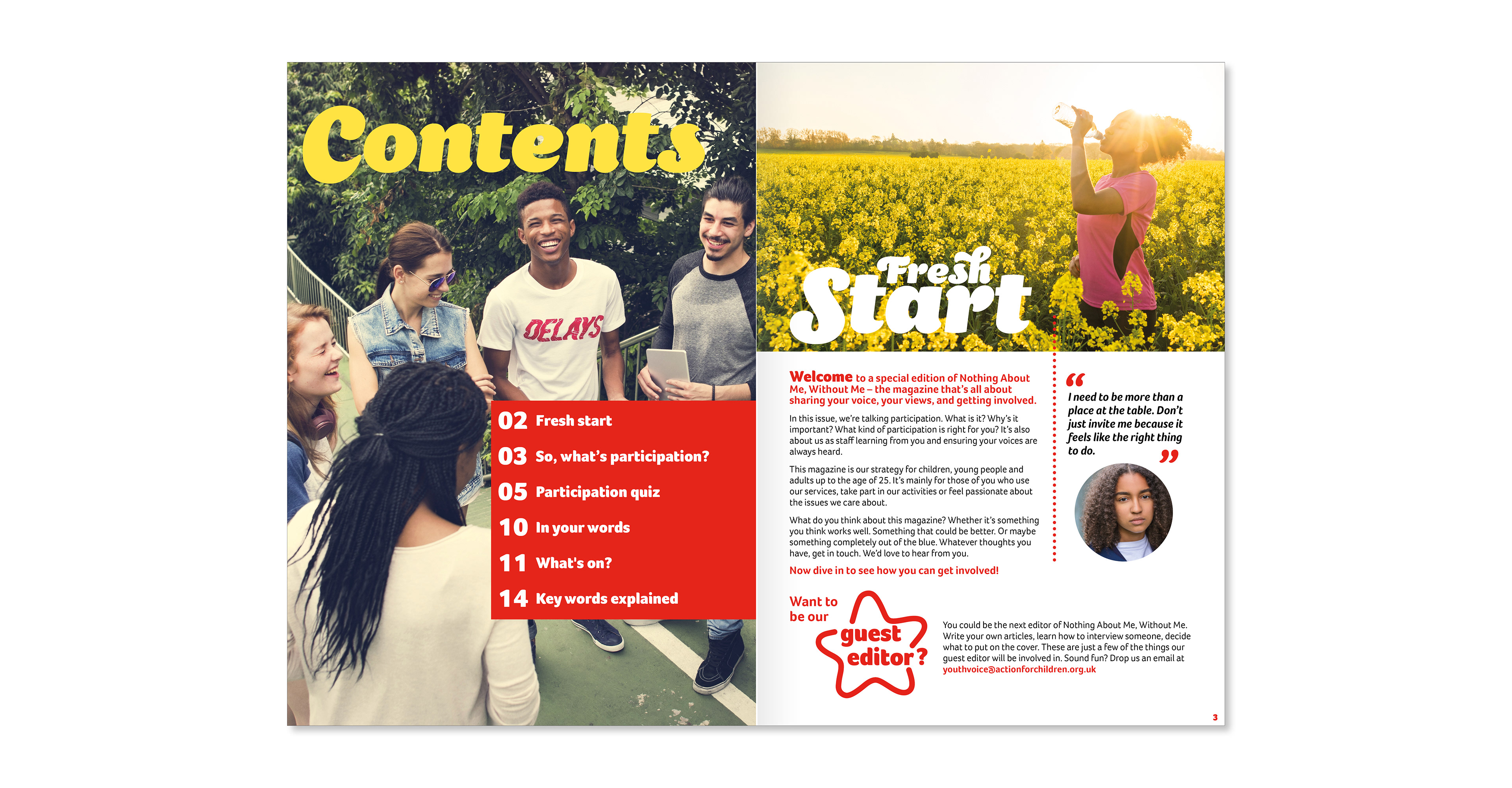 "Nothing about me, without me" was the magazine created to engage our young audience and encourage them to be an ambassador for the charity. I was tasked with creating the magazine working along the Engagement team and internal copywriter.