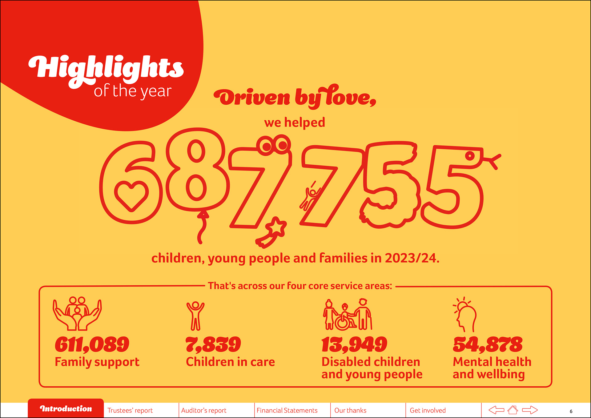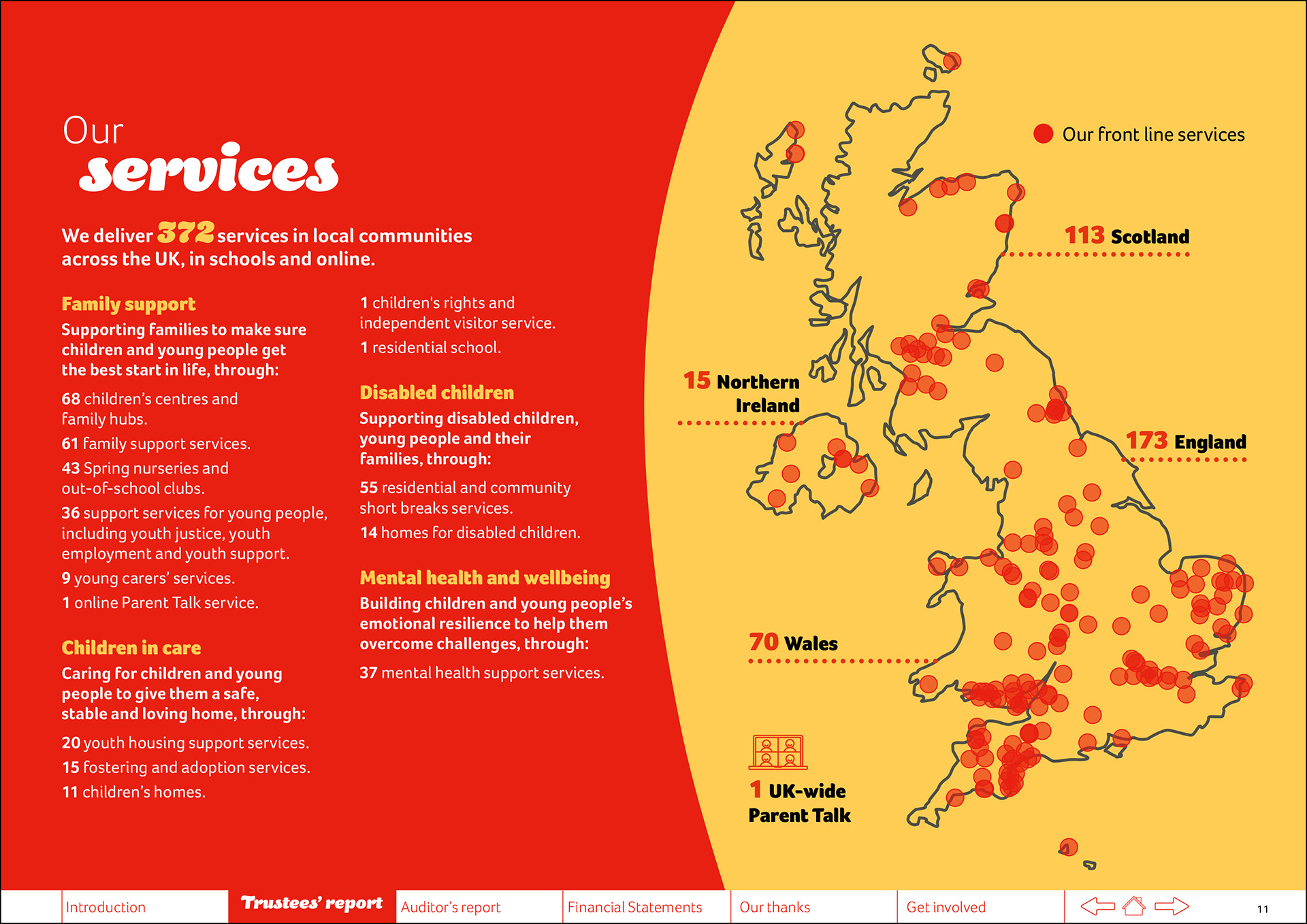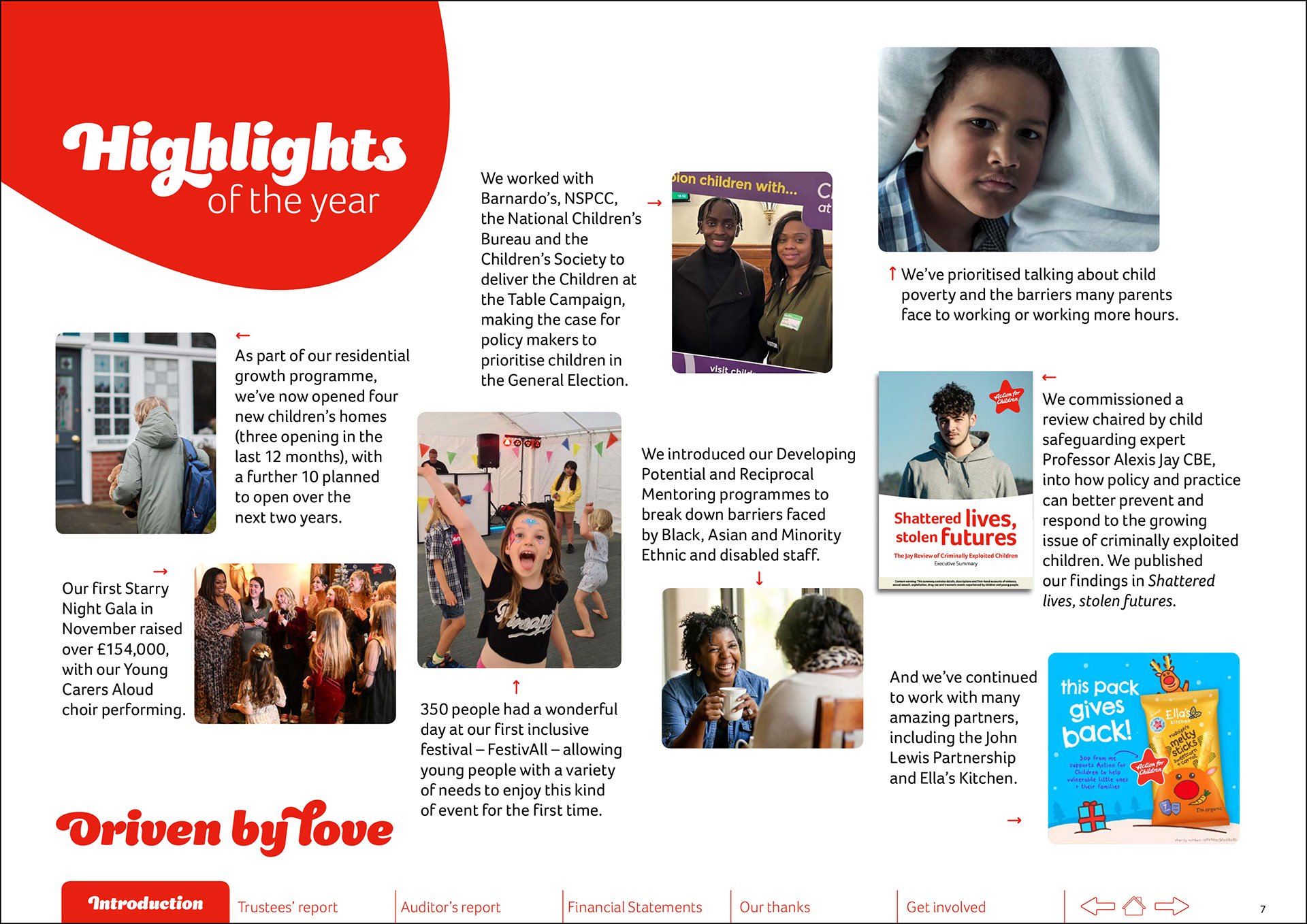 I have worked on the Action for Children annual report for the past 3 years. Each year it reflects our latest brand visuals while reporting on the important work the charity has undertaken over the year. I will initially present concepts for the look and feel, with the later artwork stages being worked on by our freelance team.