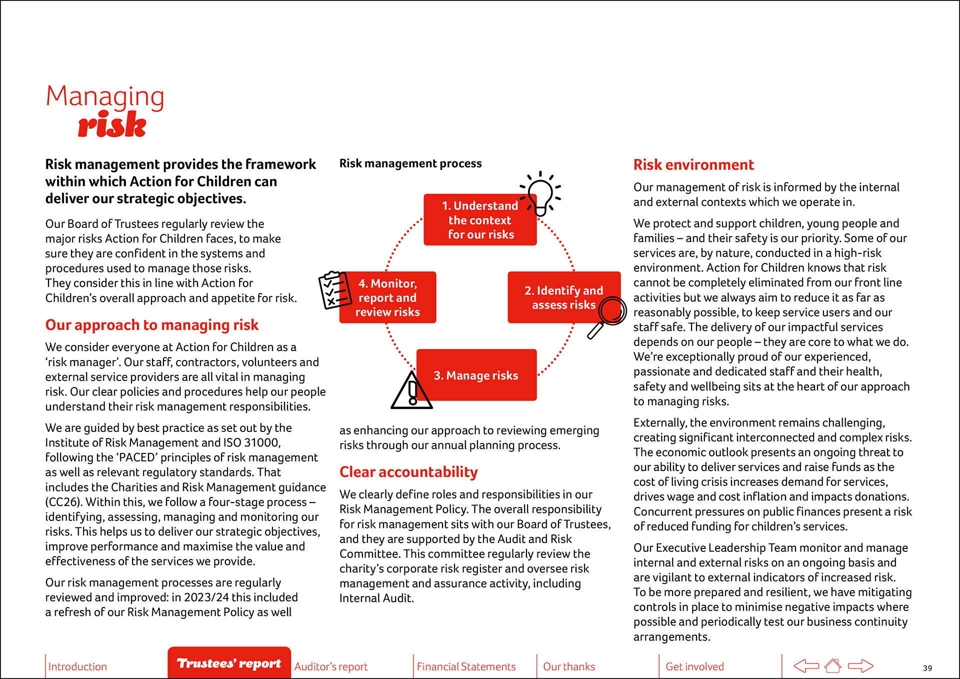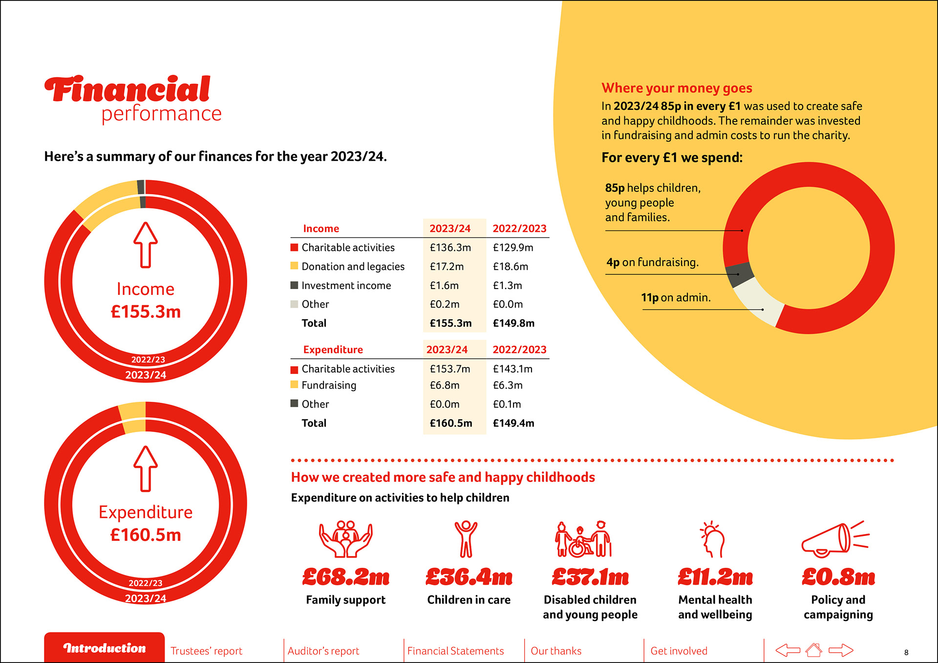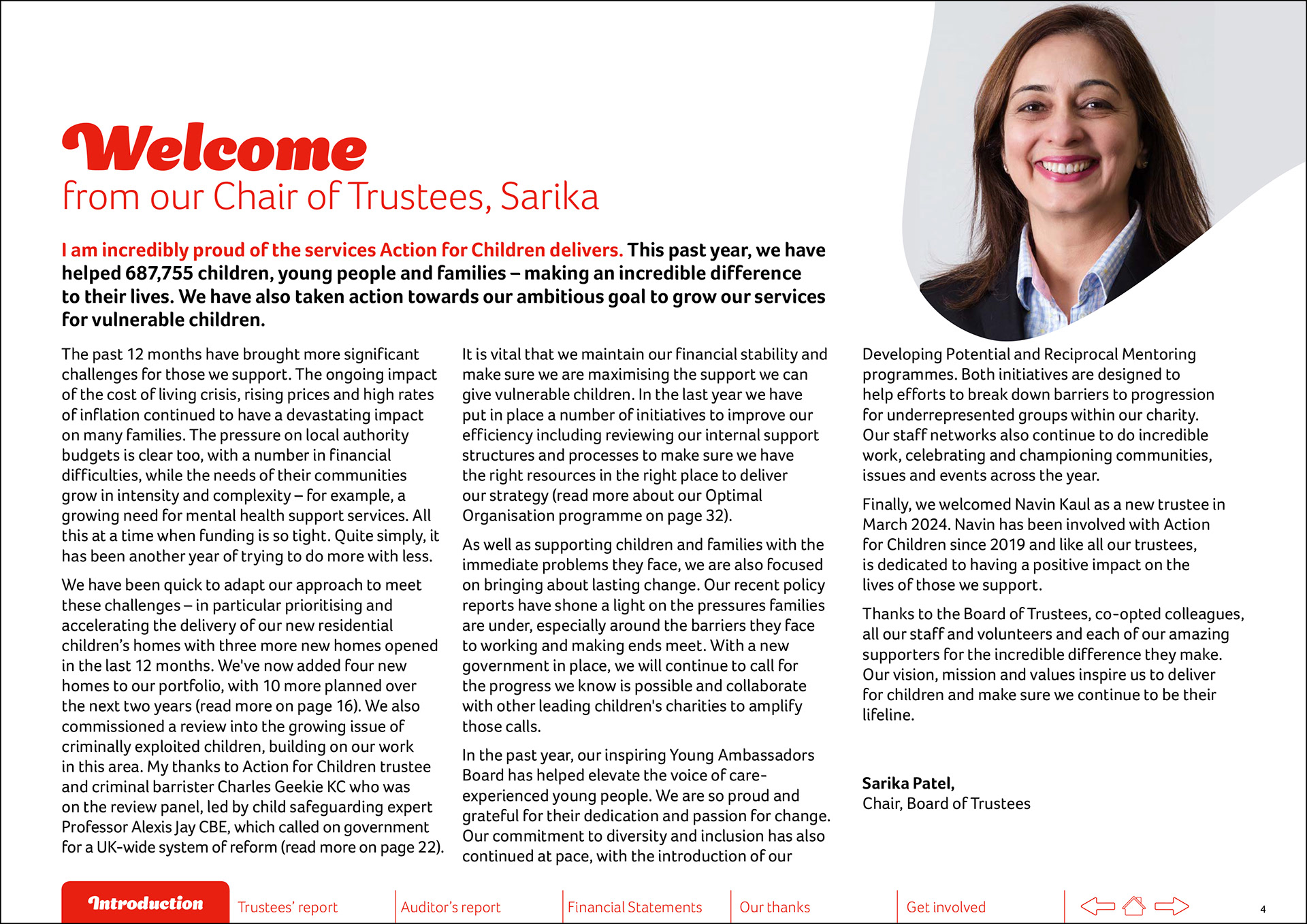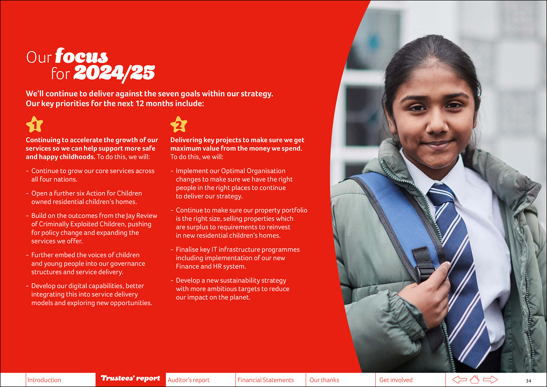 I have worked on the Action for Children annual report for the past 3 years. Each year it reflects our latest brand visuals while reporting on the important work the charity has undertaken over the year. I will initially present concepts for the look and feel, with the later artwork stages being worked on by our freelance team.