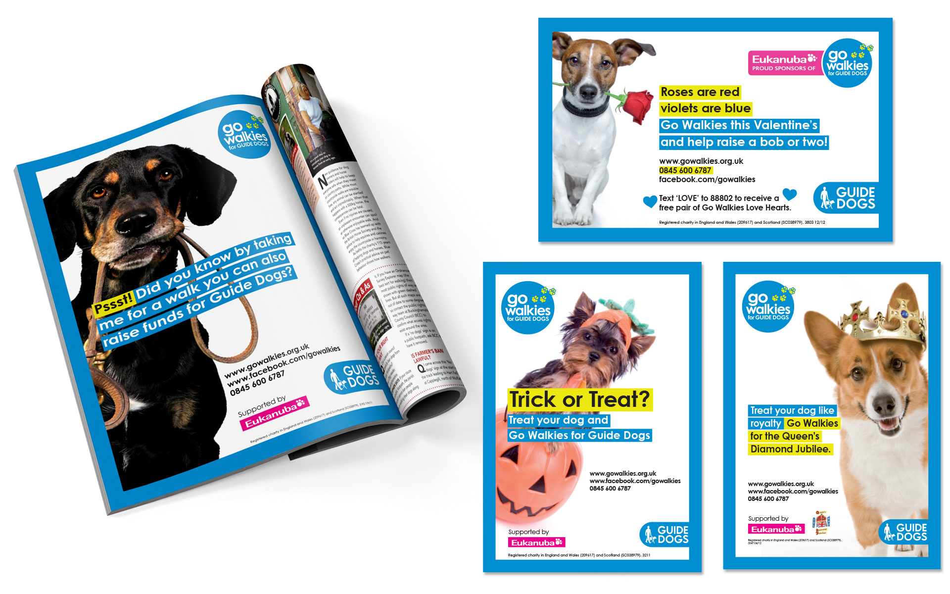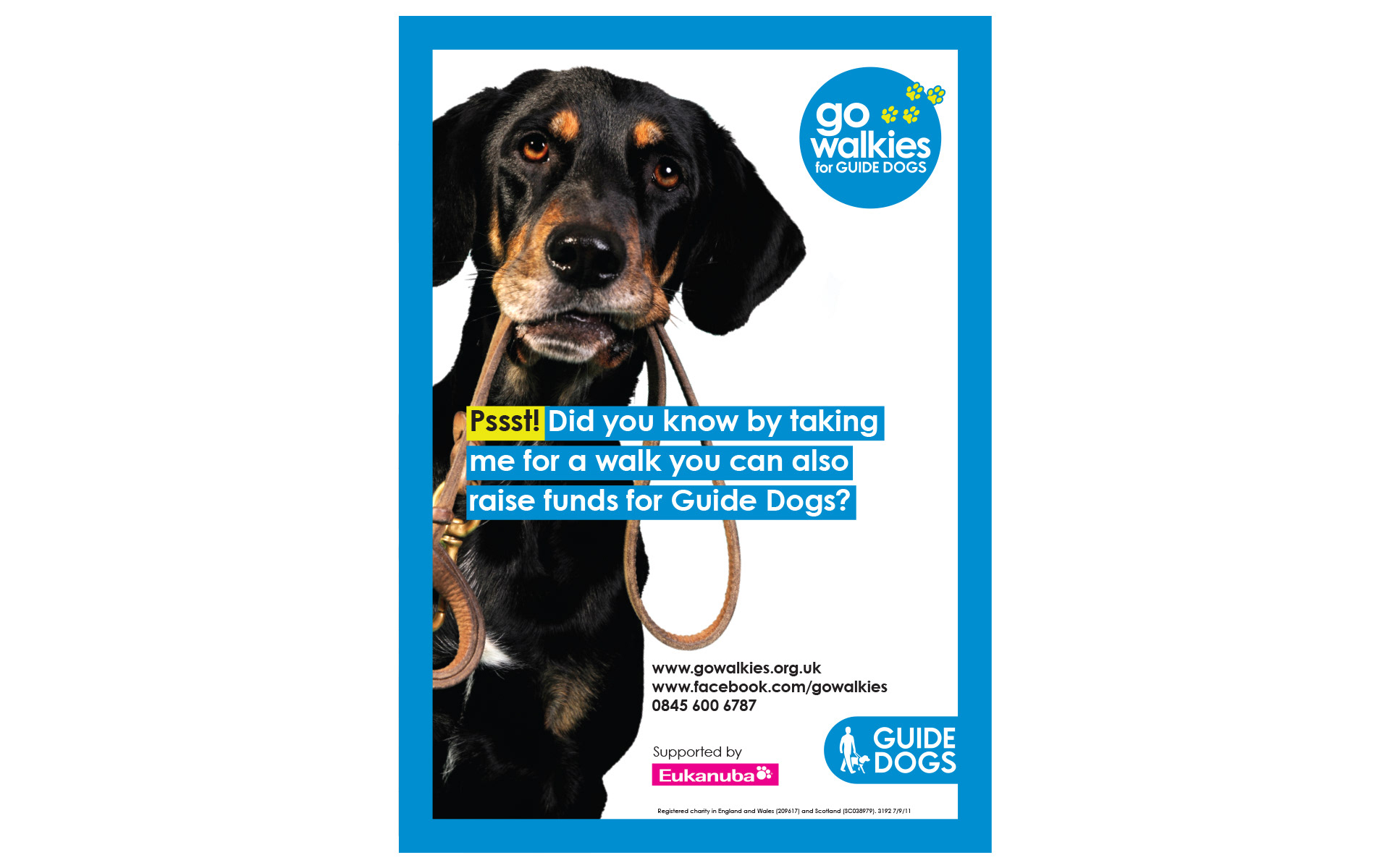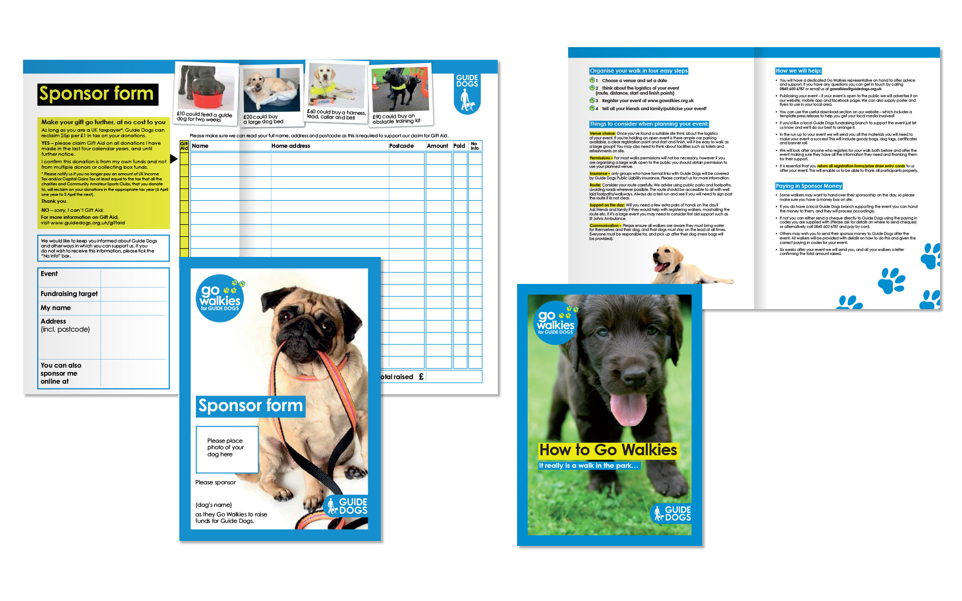 Following the Guide Dogs rebrand I was asked to look at refreshing Go Walkies' identity. The logo, look and colours were brought in-line with the main brand (it originally stood outside the main brand with its own colours and logo) while still maintaining an individual feel.