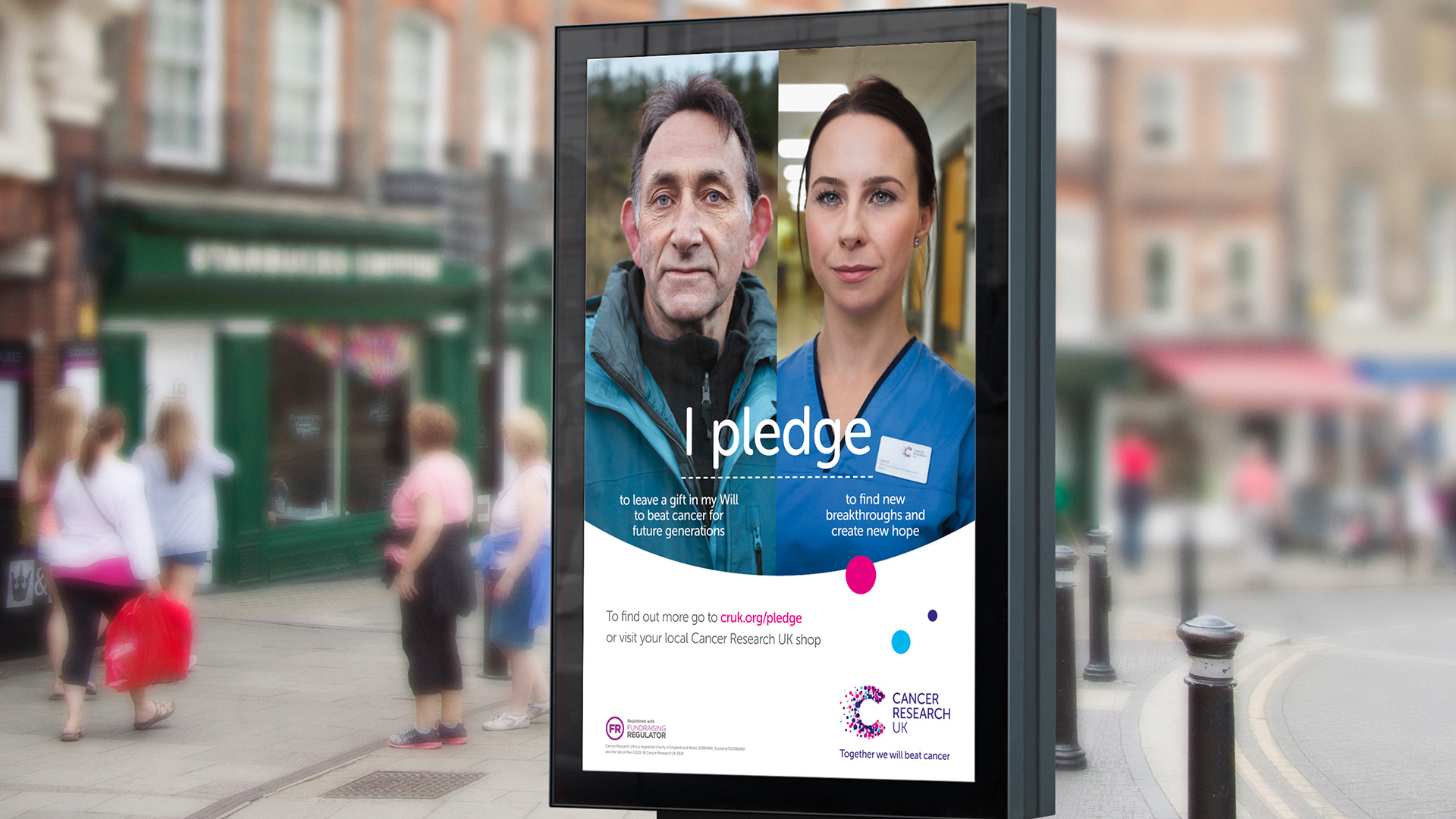 'I pledge', the new legacy platform, is a way of talking about the importance of gifts in Wills to all of Cancer Research UK’s different audiences. By asking people to pledge, they are declaring their intent to help beat cancer for future generations.
