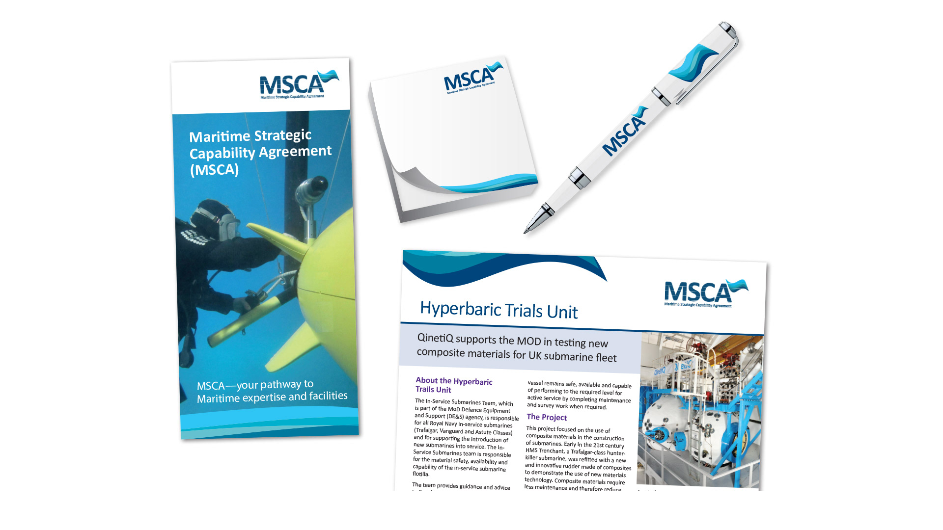 A 15 year service level contract called the Maritime Strategic Capability Agreement (MSCA) was signed between QinetiQ and UK MOD. I was tasked to create an identity for the MSCA that would take aspects from both partners' brands.