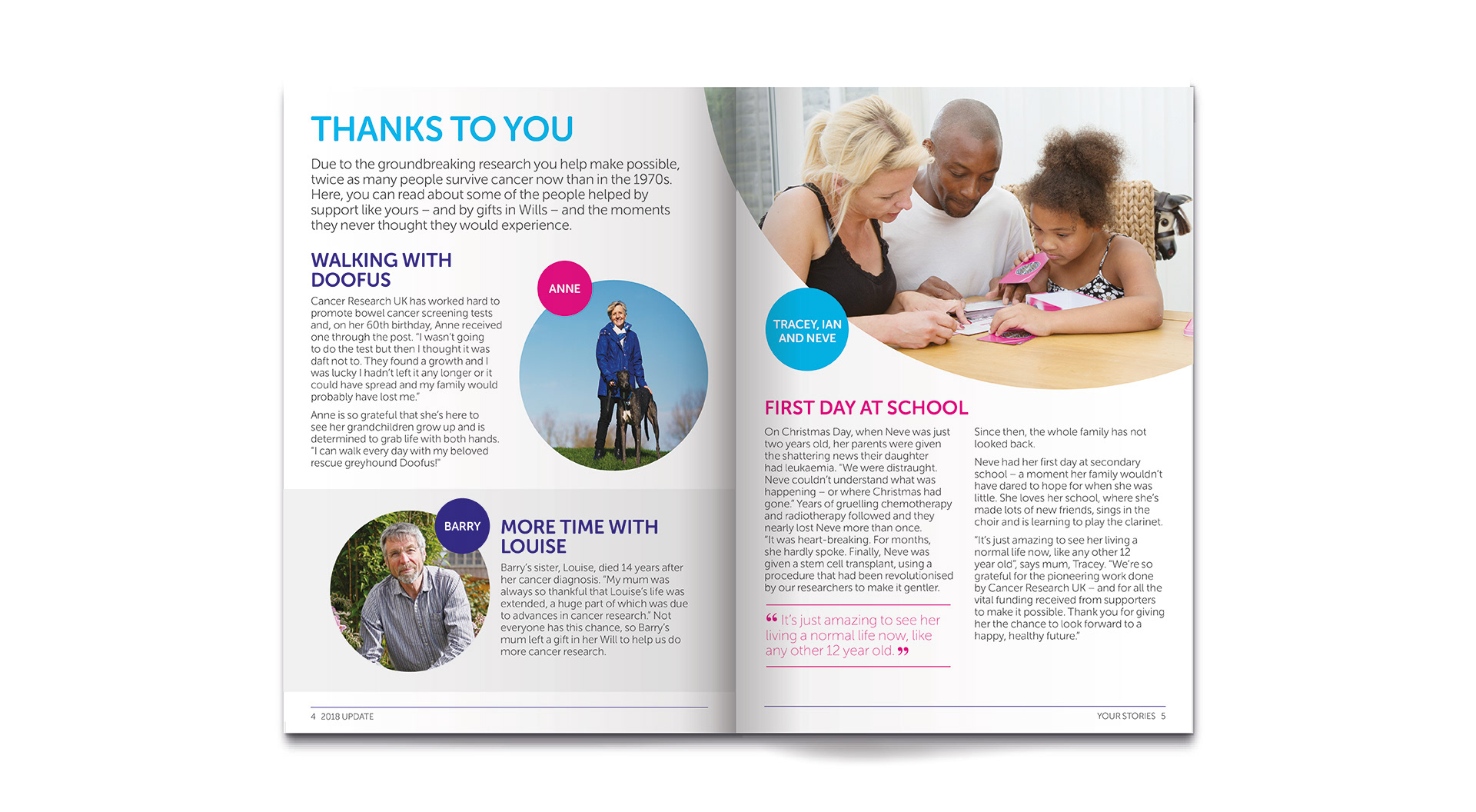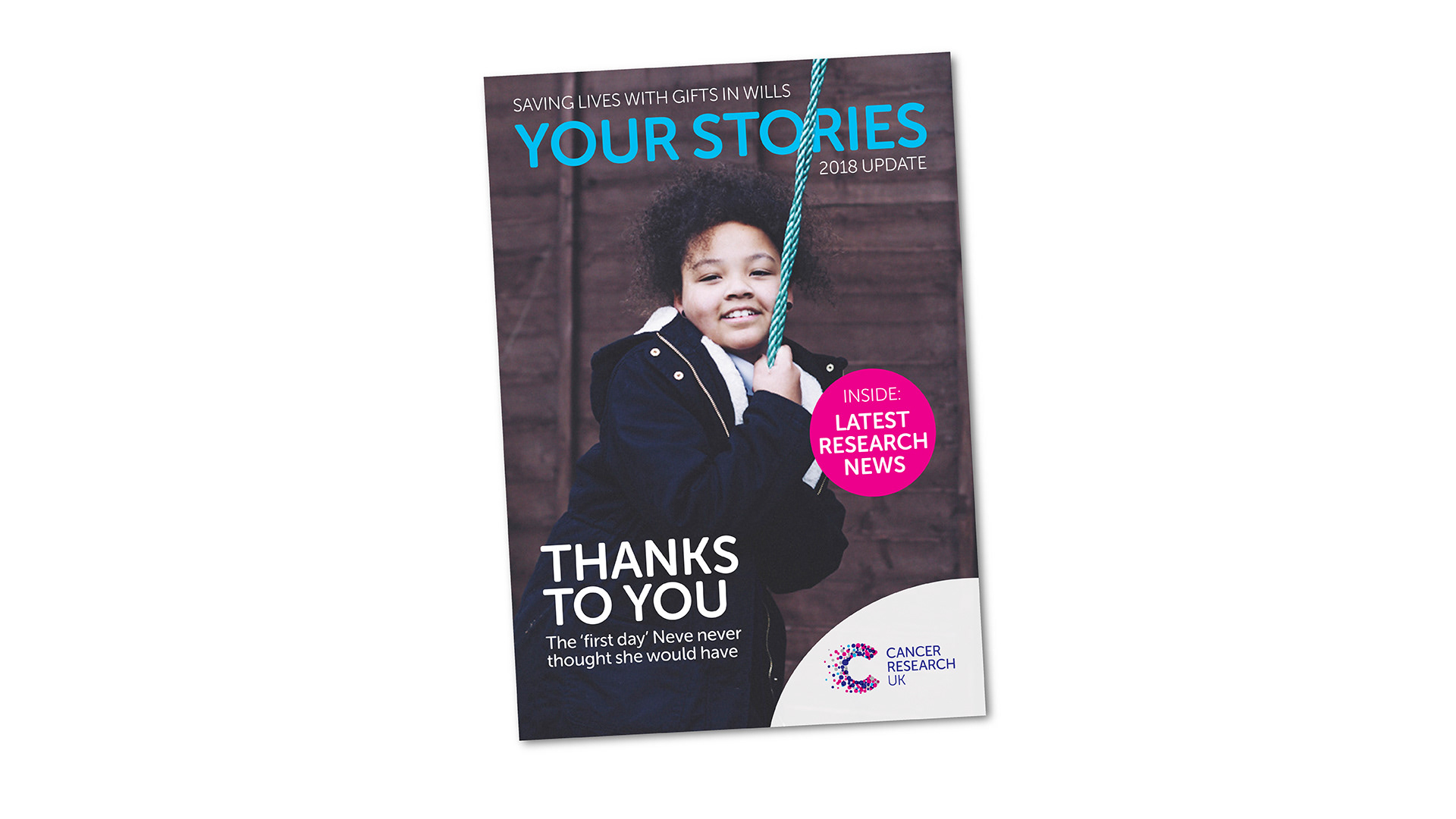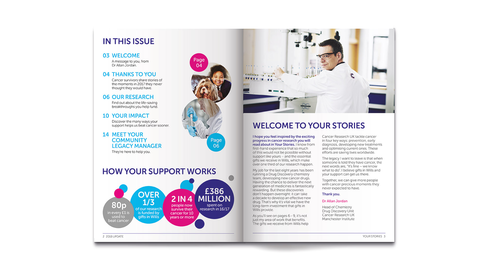 'Your Stories' is the annual update sent to Cancer Research UK supporters who have pledged to leave a gift in their Will to the charity. Its principal aim is to keep supporters informed and engaged. I was asked to re-design the publication to make it more supporter centric.