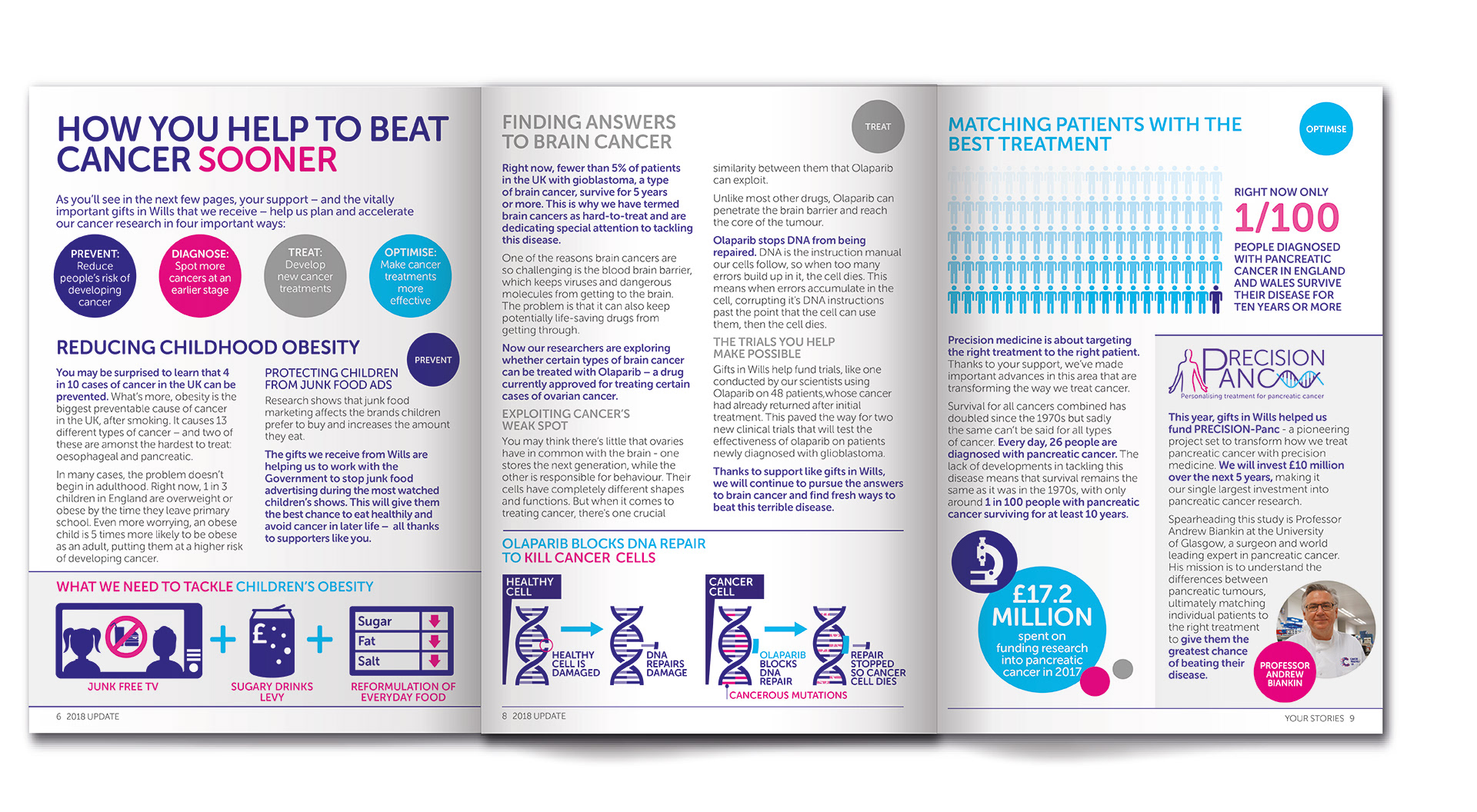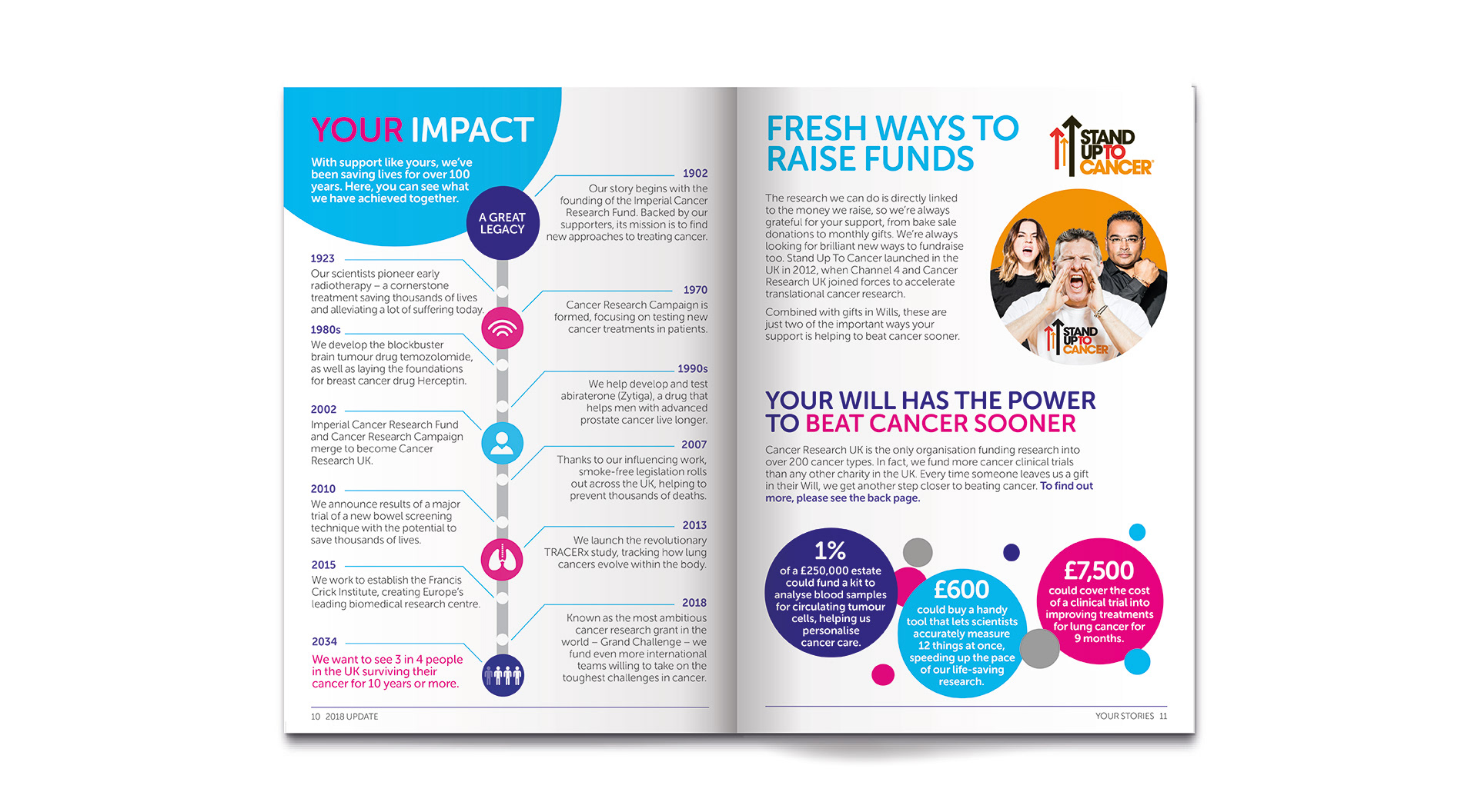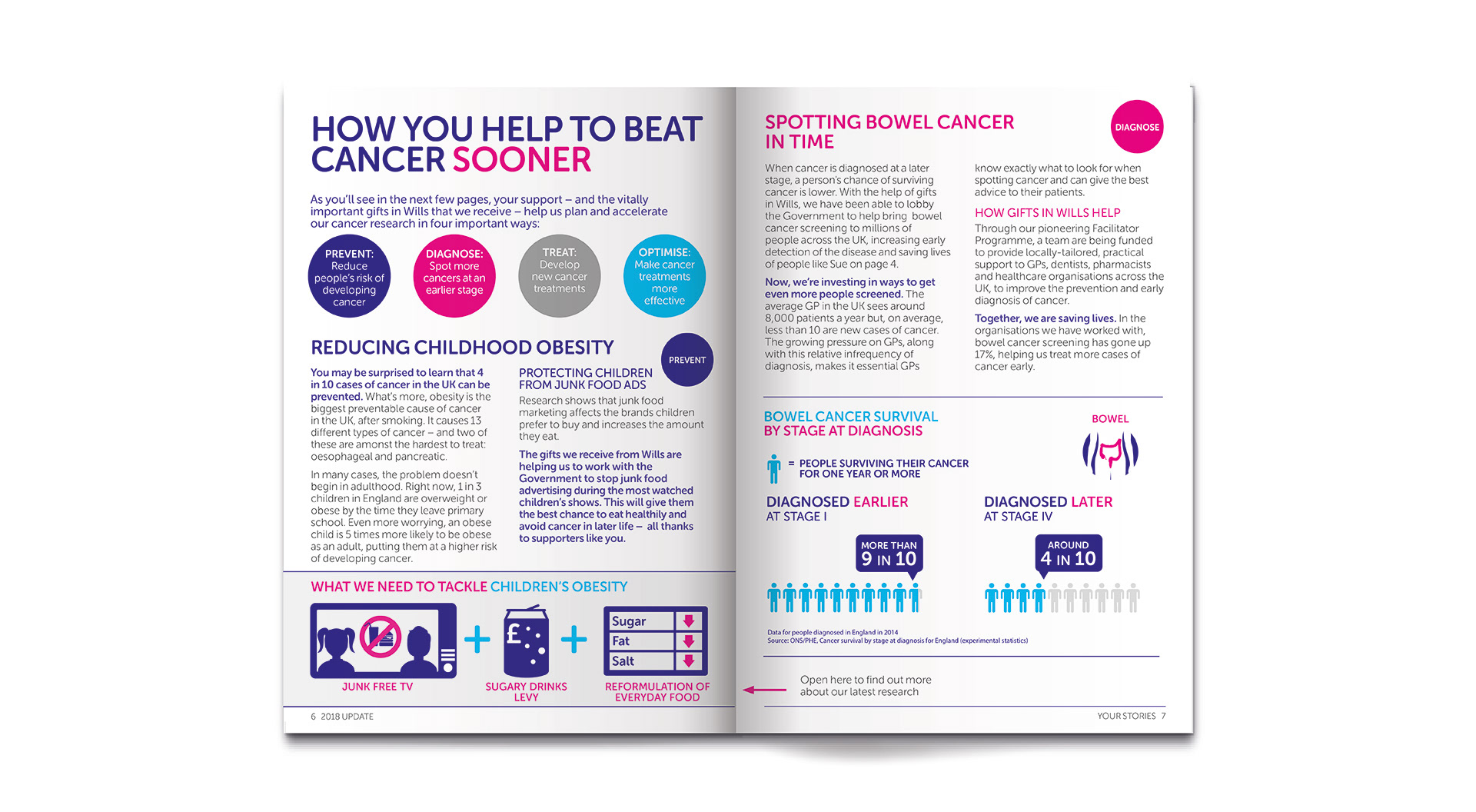 'Your Stories' is the annual update sent to Cancer Research UK supporters who have pledged to leave a gift in their Will to the charity. Its principal aim is to keep supporters informed and engaged. I was asked to re-design the publication to make it more supporter centric.