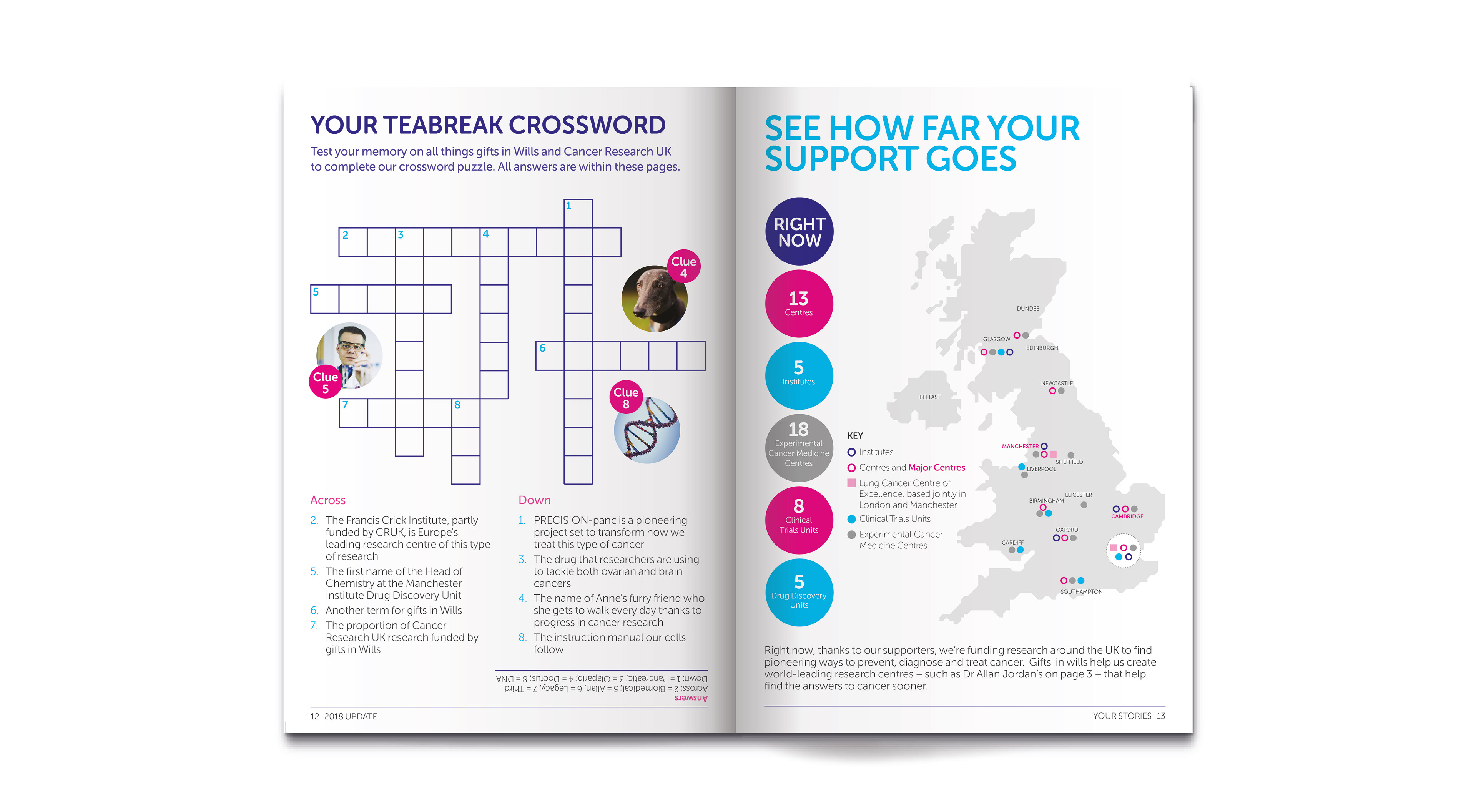 I created initial concepts that proposed giving the magazine a more approachable feel similar to weekly publications such as 'Woman's Own'. From this I re-designed the publication using more people focused imagery and also introduced interactive elements such as crosswords. The science remained as a pull-out within the magazine. Alongside this, I changed the title to 'Your Stories' and suggested the copy be more personal so the reader felt more engaged and part of the charity's cause.